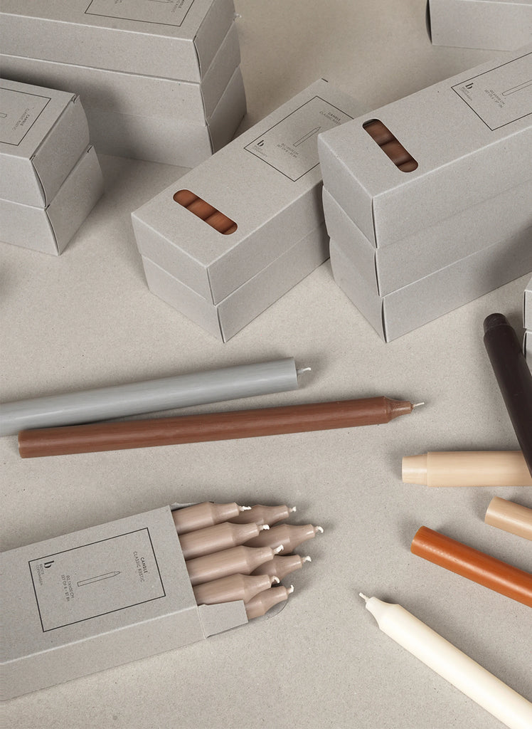 Eine klassische Stabkerze von Broste Copenhagen in verschiedenen Farben und Größen. Die oben flachen Stabkerzen werden auch Kronenkerzen genannt.