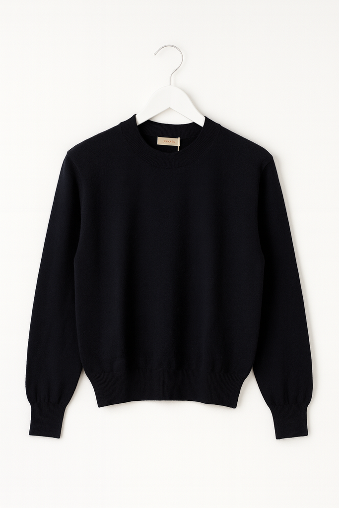 Dieser Rundhalspullover verbindet puristische Eleganz mit höchstem Tragekomfort. Klassisch geschnitten, mit feinen Rippbündchen und einem formstabilen Rundhalsausschnitt, ist er ein vielseitiger Begleiter für jede Gelegenheit – ob casual zur Jeans oder stilvoll zum Rock.