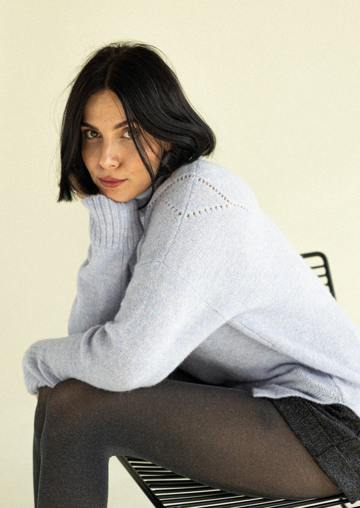 Dieser schöne Rollkragenpullover ist aus weichem Strick gefertigt, ideal für die kälteren Monate. Das besondere Detail ist der Lochstrick an Schulter und Manschette.
