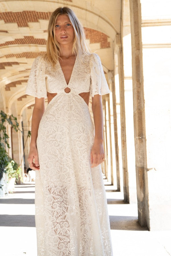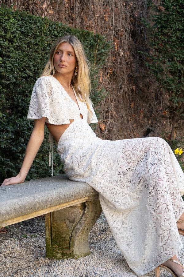 Der Empire-Schnitt, die Schmetterlingsärmel und die zarte Öffnung an der Taille machen dieses wunderschöne Spitzenkleid zu einem leichten, femininen Boho-Style Kleid.