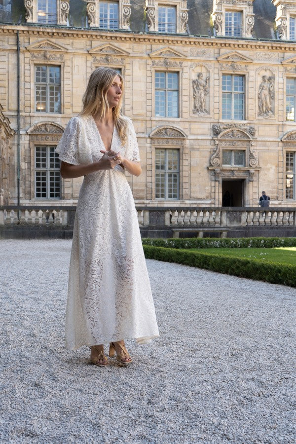 Langes Kleid aus weisser Spitze.