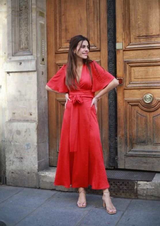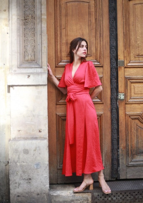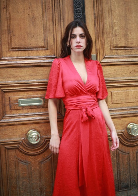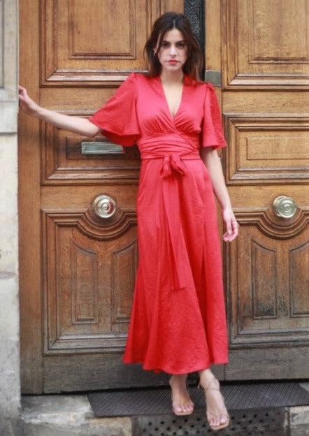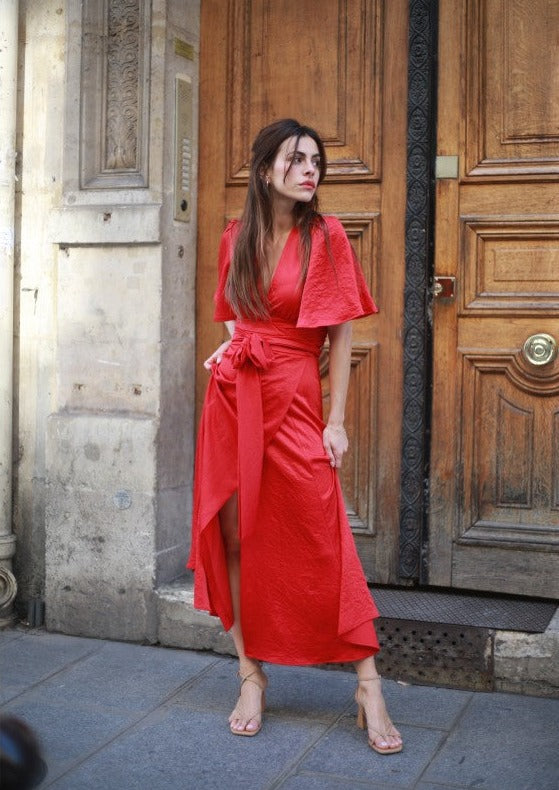 Wickelkleid mit Flügelärmelchen und Volants am unteren Rockteil.