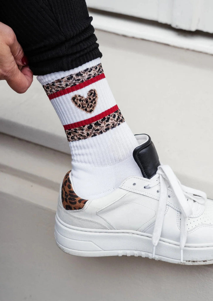 Premiumsocken in weiss aus kuschelig-weicher Baumwolle mit eingewebtem Leo Style Artwork. Neben den Leo Streifen in gedeckten Erdtönen bilden zwei dunkelrote schmale Streifen einen farblichen Akzent und umranden harmonisch das Leo Herz.