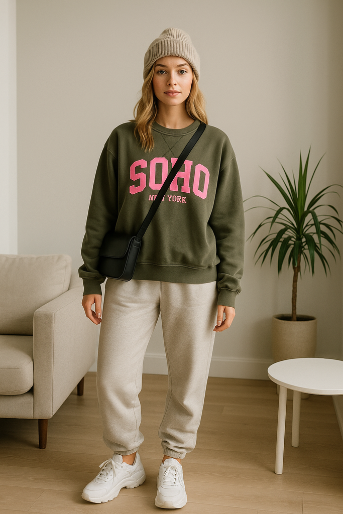 Bring New-York-Vibes in deinen Alltag mit unserem leicht oversized „SOHO NEW YORK“ Sweatshirt in kaki und rosa-farbenem Print. Der hochwertige Baumwollmix sorgt für ein gemütliches Tragegefühl, während der moderne Schnitt deinem Outfit einen entspannten, stilvollen Look verleiht. Perfekt kombinierbar mit Jeans, Stoffhosen oder Shorts – für den Coffee-Run, Spaziergänge in der Stadt oder gemütliche Homeoffice-Tage.