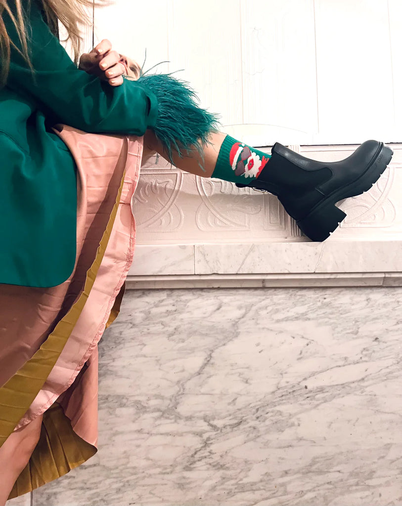 Diese Weihnachtssocken mit dem Schriftzug „Love Santa“ in verspielten Buchstaben zaubern dir garantiert ein Lächeln ins Gesicht und sind das perfekte Accessoire, um in festliche Stimmung zu kommen. Der Weihnachtsmann, der lässig mit Herzchen-Sonnenbrille und Kussmund posiert, verleiht den Socken eine einzigartige Mischung aus Weihnachtszauber und cooler Gelassenheit.