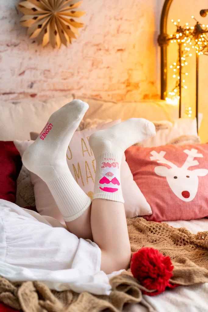 Diese Weihnachtssocken mit dem Schriftzug „Love Santa“ in verspielten Buchstaben zaubern dir garantiert ein Lächeln ins Gesicht und sind das perfekte Accessoire, um in festliche Stimmung zu kommen. Der Weihnachtsmann, der lässig mit Herzchen-Sonnenbrille und Kussmund posiert, verleiht den Socken eine einzigartige Mischung aus Weihnachtszauber und cooler Gelassenheit.