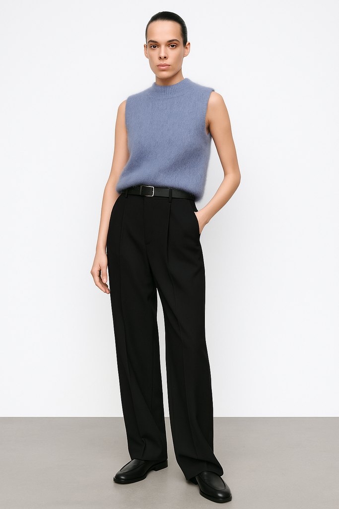 Styling-Tipp: Kombiniere den Pullunder mit einer weißen Oversize-Bluse und weiten Anzughosen für einen modernen Business-Look – oder trage ihn leger zu Jeans und Sneakers.