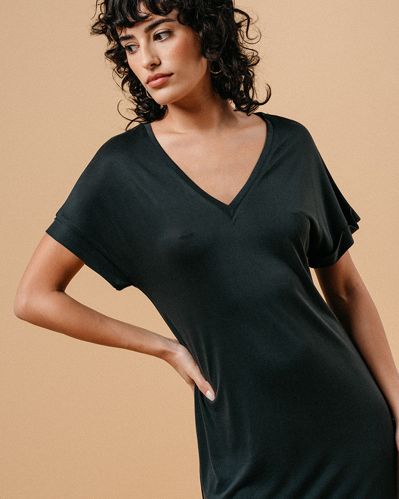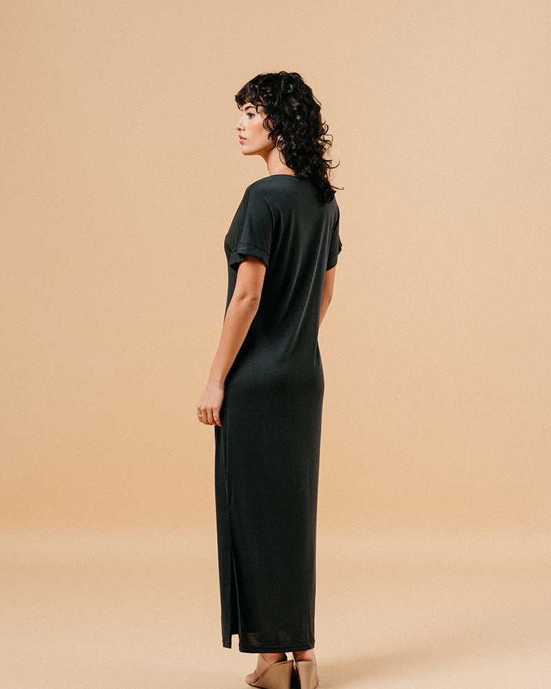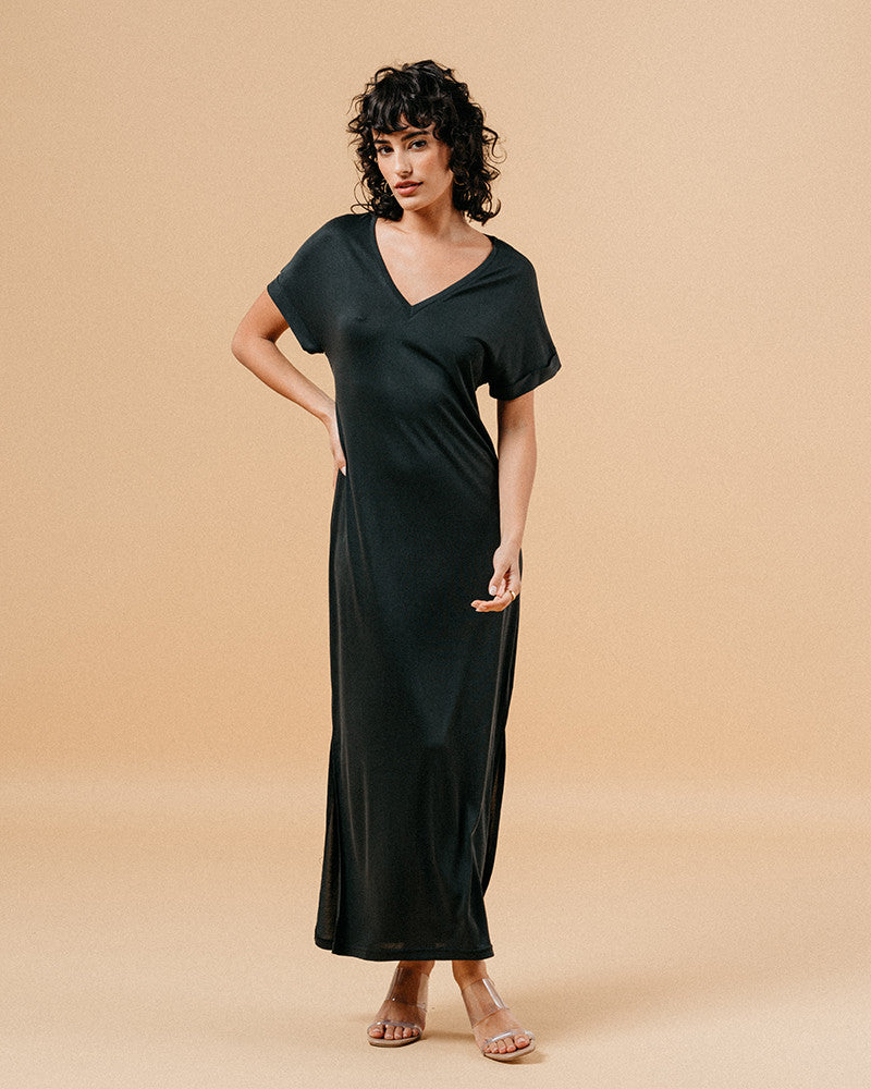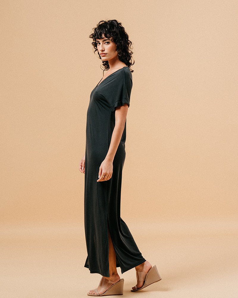 Langes Kleid mit V-Ausschnitt und kurzen, fallenden Ärmeln mit Aufschlag. Das Kleid hat Schlitze an der Seite. Sein Stil ist lässig.