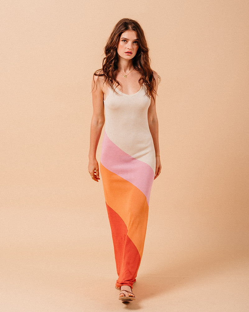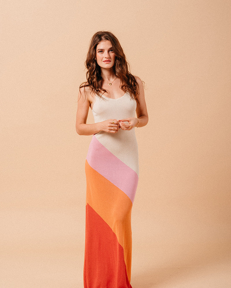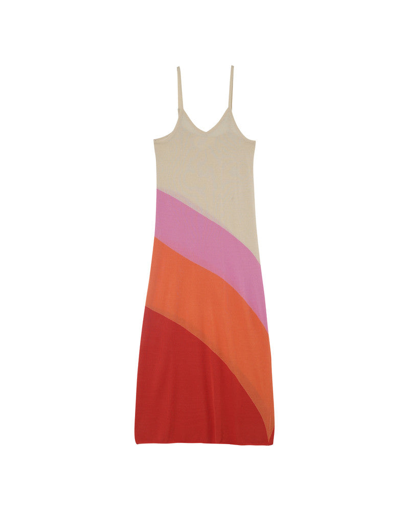 Langes Strickkleid mit V-Ausschnitt und schmalen, verstellbaren Trägern. Sein Intarsienstrick bildet einen Farbverlauf. Der Schnitt ist trapezförmig.