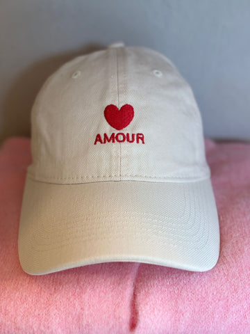 Creme farbenes Cap mit roter "Amour" Stickerei.