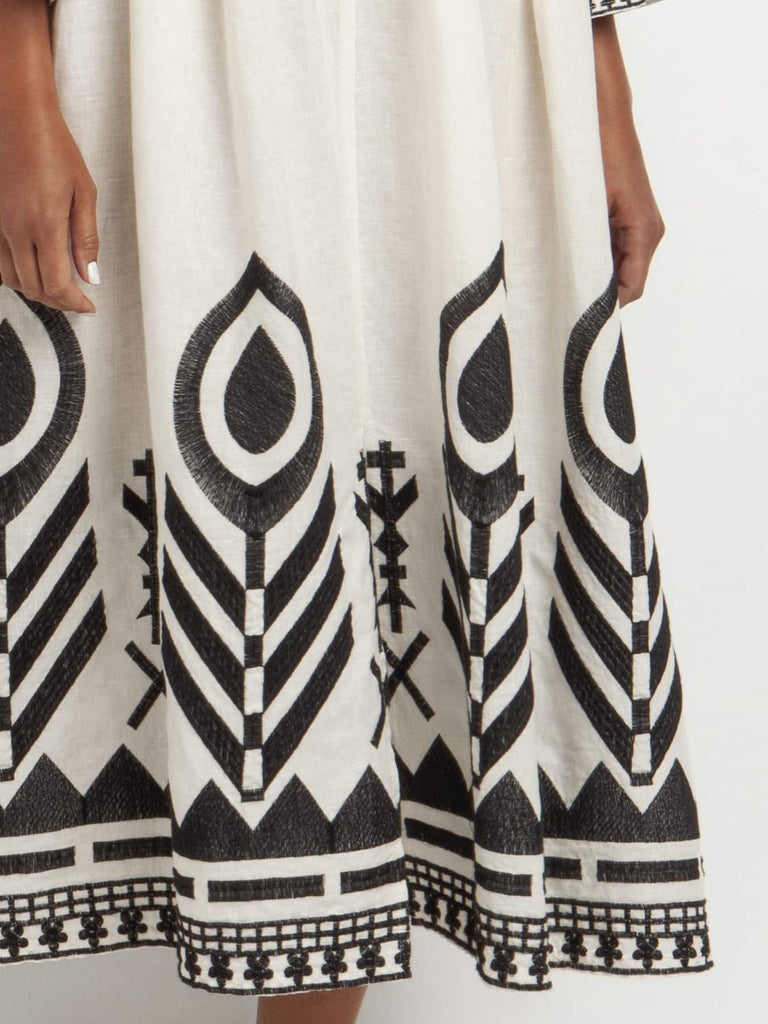 Greek Archaic Kori Linen Feather Midi Dress Weiß Schwarz