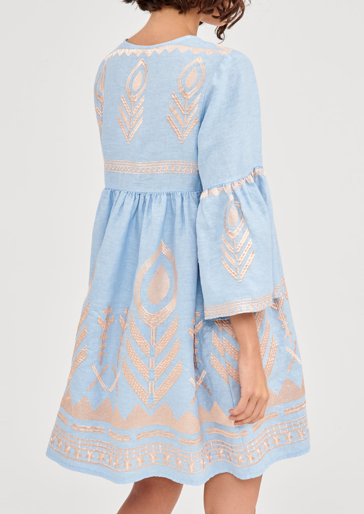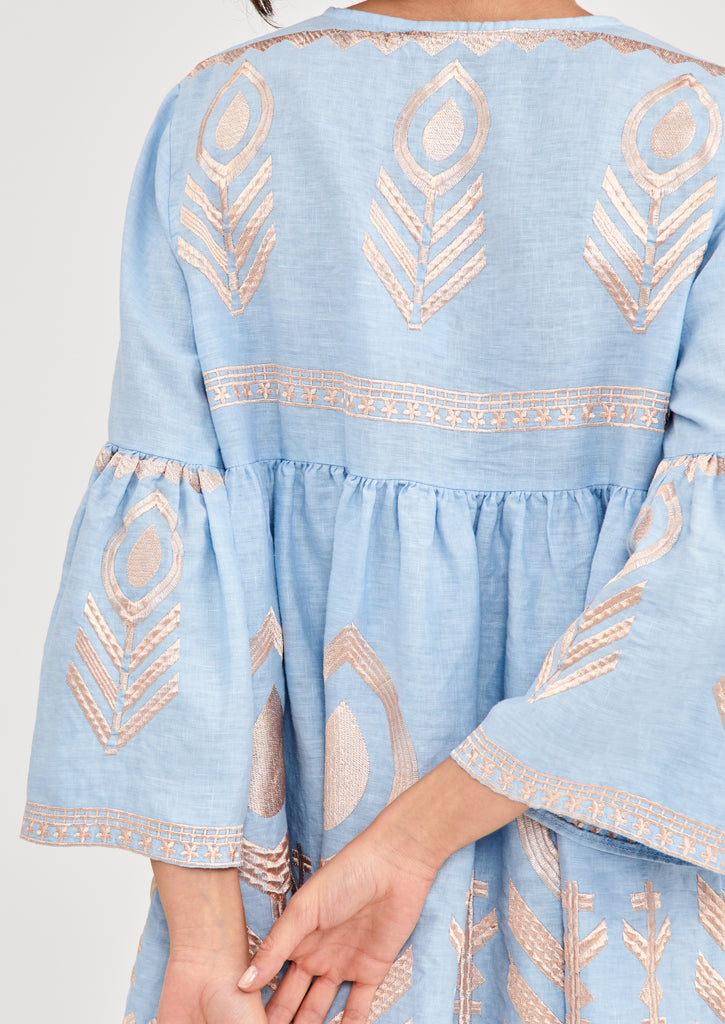 GREEK ARCHAIC KORI Linen Feather Dress Short Light Blue/ Pink Bronze
