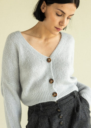 Diese kuschelige Strickjacke kannst Du dank ihrer verkürzten Form ideal mit high waist pants und Röcken kombinieren.